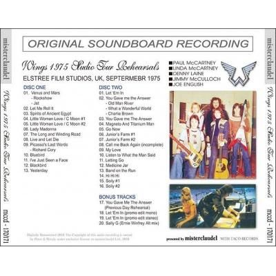 またまた出ましたウイングスの凄い音源!1975年9月、ワールドツアーに先駆けて行われたスタジオにおけるツアーリハの様子をサウンドボードで収録!!! リハといっても、曲目を見てもらえればわかるとおり、ほぼワンステージまるまる通して演奏しているゲネプロで、聴きごたえたっぷり。「Venus And Mars」メドレーから始まり「Soily」で終わるセットリストは本番さながらのリハーサルです。曲によっては2度演奏していたり、そこはさすがにリハーサル、入念にチェックが行われている様子がわかります。「Let ‘Em In」はまだ『WINGS AT THE SPEED OF SOUND』がリリースされる前のもので、この時点で演奏されているのが驚きです。また「Listen To What The Man Said」のイントロではレコード通りポールのムニャムニャといった呟きが聞こえるため、本来このような演出であったのかと思わされます。