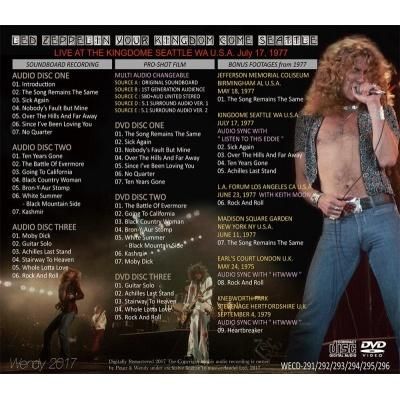 1977年7月17日シアトルはキングドームでのライヴをサウンドボード音源とプロショット映像で完全収録。さらに音声は2種類の5.1CHサラウンド、サウンドボード、オーディエンス、サウンドボード+オーディエンスのマトリクスと、5種類のソースをそれぞれ独立して楽しめるよう切換えで収録。3枚のDVDの収録可能データ量を目イッパイ使って、DVDの機能と特性をフルに活用している。加えてメニュー画面のバックに流れている「Jimmy Page Guitar Solo」は1977年6月23日ロサンゼルス公演、バッジホルダーの日のサウンドボード音源である。音源としても映像としても、シアトル公演の決定盤であろう。既発盤をお持ちの方は是非本作を見比べて頂きたい。美しいピクチャー・ディスク仕様の永久保存がっちりプレス盤。